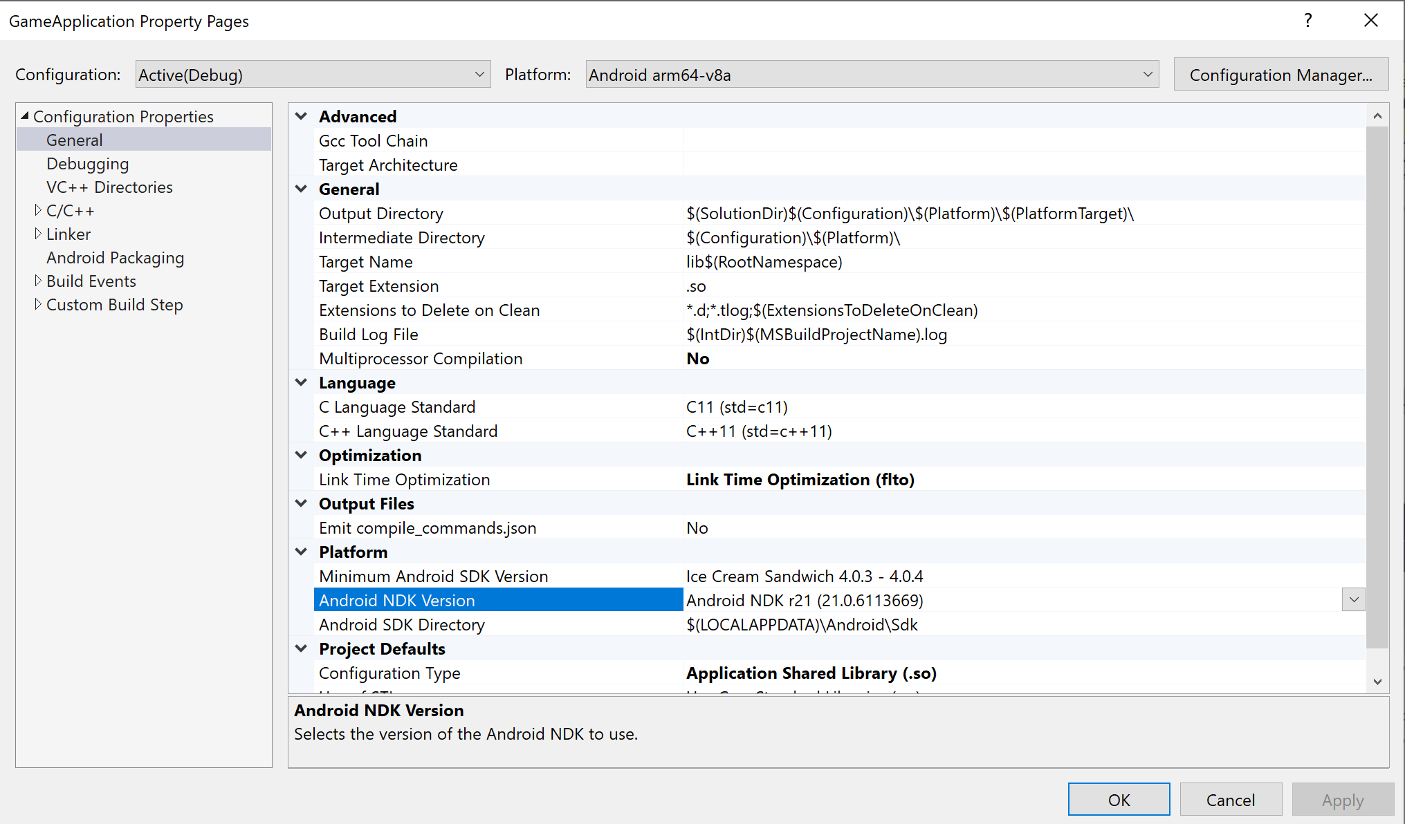 AGDE utilise le NDK que vous sélectionnez pour déterminer les options de compilation et d'association par défaut lors de la compilation de la partie C/C++ de votre application.