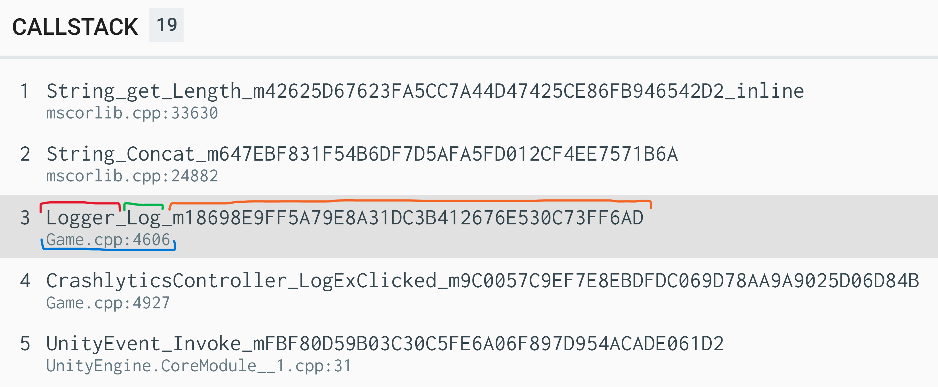Andernfalls hat der Dateiname den Standardnamen „Assembly-C#“. Abbildung 3 zeigt beispielsweise den Fehler in der Datei Game.cpp (blau hervorgehoben), die in der Assembly Definition-Datei definiert ist. Logger ist der Klassenname (rot hervorgehoben) im C#-Script, gefolgt vom Funktionsnamen (grün hervorgehoben). „Finally“ ist der vollständige Name, der vom IL2CPP-Konverter generiert wurde (orange hervorgehoben).