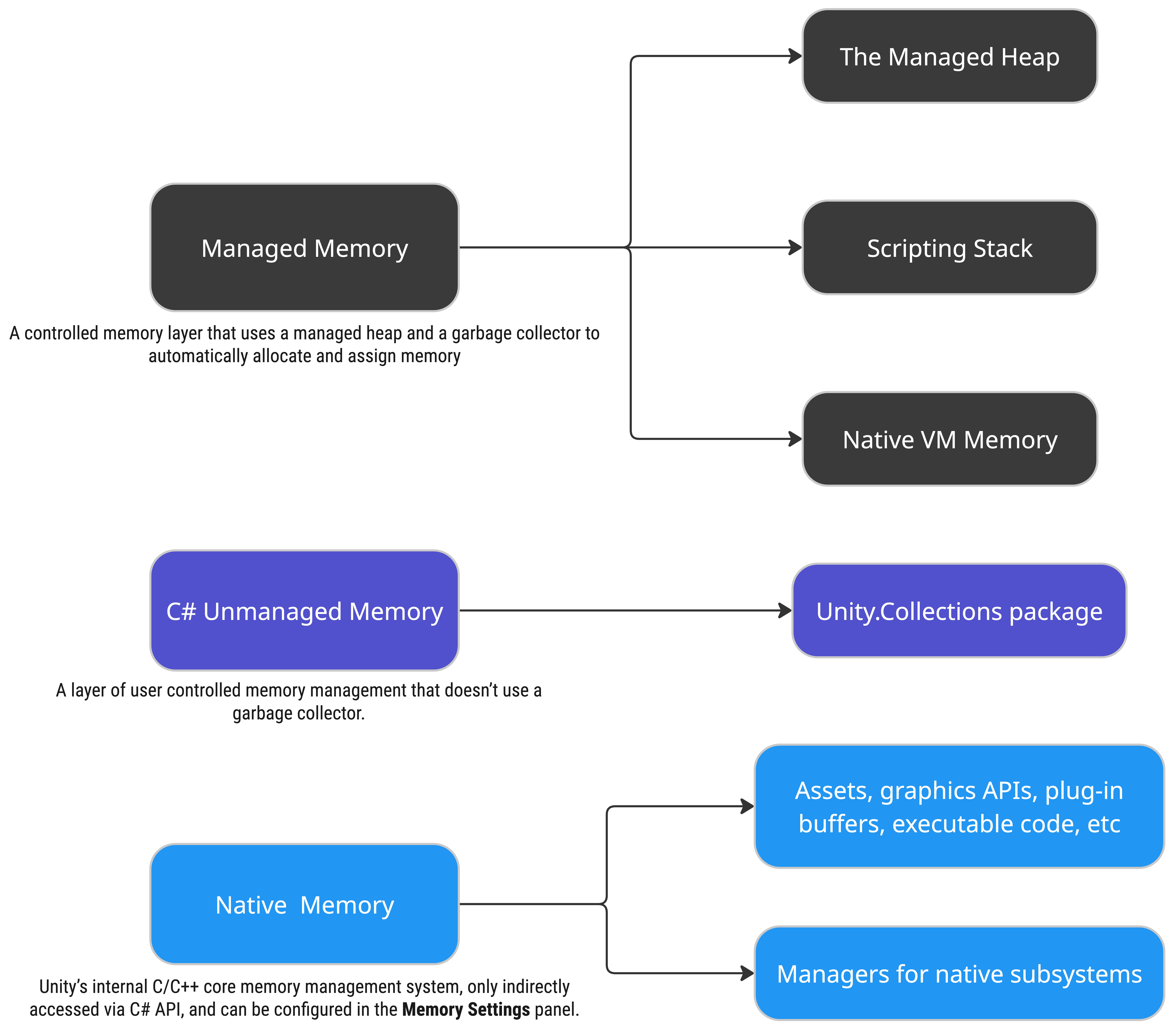 La administración de memoria de Unity implementa una capa de memoria controlada que usa un montón administrado y un recolector de basura para asignar y asignar memoria automáticamente. El sistema de memoria administrada es un entorno de secuencias de comandos en C# basado en Mono o IL2CPP. El beneficio del sistema de memoria administrada es que utiliza un recolector de elementos no utilizados para liberar automáticamente las asignaciones de memoria.