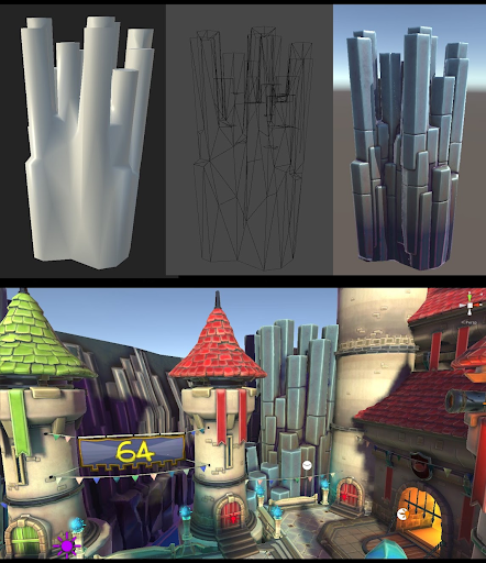 Figure 18. The topology, wireframe, and final version of a rock from the Armies tech demo.