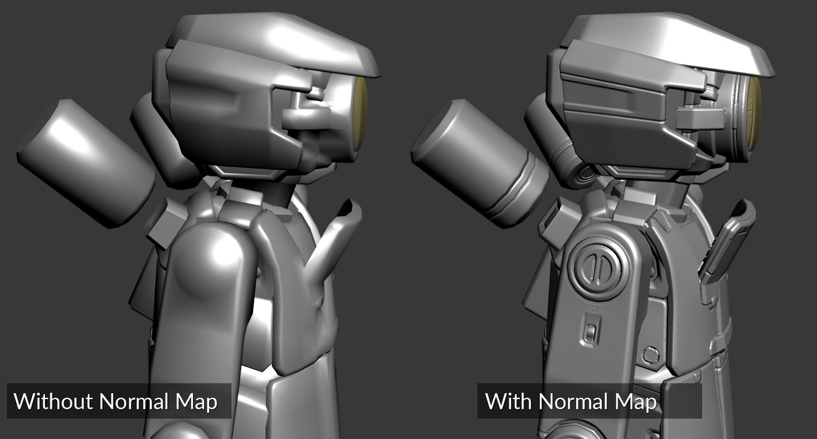 Don’t model small details with high-density triangle meshes. Use textures and normal maps for fine detail. The following example shows the same mesh with and without a normal map.