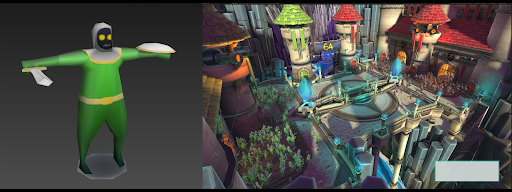 We recommend using more triangles on foreground objects and fewer on background objects. This is more beneficial for games with a static camera point of view (POV). The following example shows an appropriate use of detail on different objects.