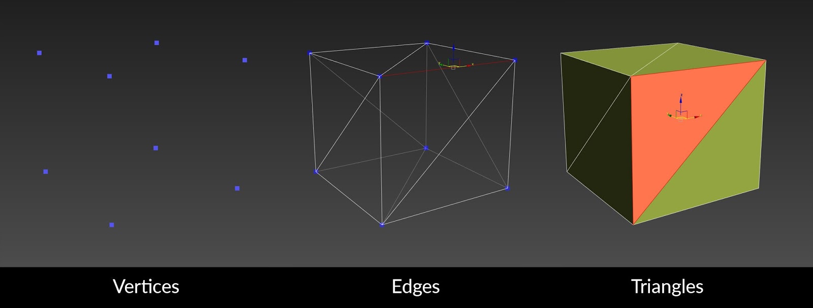 Geometry, or polygon mesh, is a collection of vertices, edges, and faces that make up the shape of a 3D object. This can be a car, weapon, environment, character, or any sort of visual asset in a game.