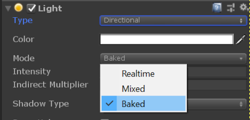 लाइट के मोड को मिक्स या बेक्ड पर सेट करें. मोबाइल टाइटल के लिए, मिक्स की तुलना में बेक्ड लाइट का इस्तेमाल करना बेहतर होता है. बेक्ड, लाइट को रेंडर करने का सबसे सस्ता तरीका है.