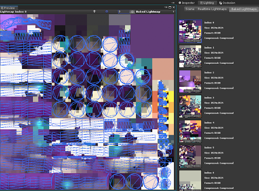 Armies डेमो के इस उदाहरण में, 1024x1024 पिक्सल वाली सात लाइटमैप इमेज हैं. मैप की झलक में, लाइटमैप पर बिछाई गई मेश दिखती हैं. चुनी गई मेश हाइलाइट की जाती हैं.
