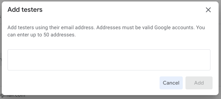 - दिखने वाले डायलॉग बॉक्स में, उन Google खातों के ईमेल पते डालें जिन्हें आपको टेस्टर के तौर पर जोड़ना है. इन्हें कॉमा लगाकर अलग करें या हर ईमेल पते को एक लाइन में लिखें.