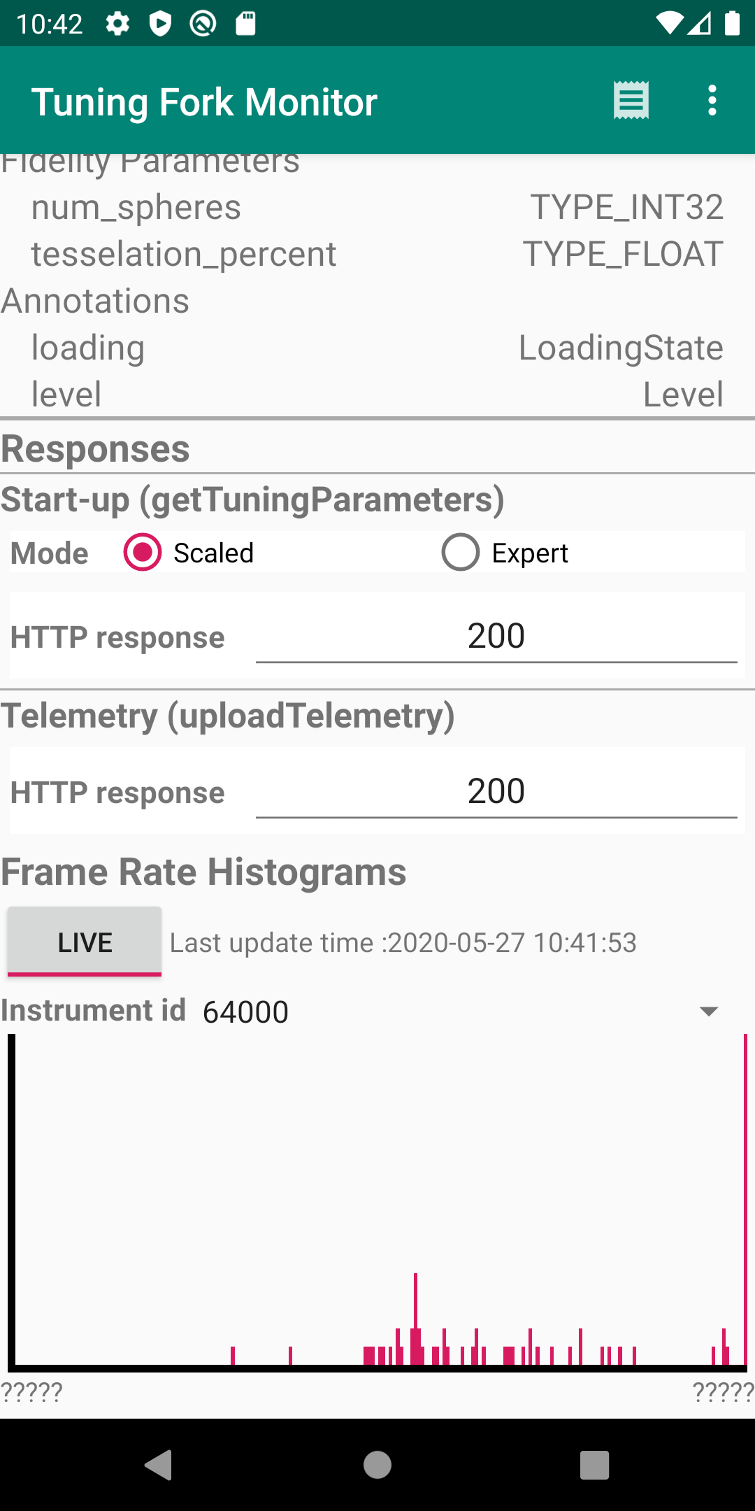 Puoi utilizzare questa funzionalità per verificare che un'app invii e riceva i dati corretti. Per verificarlo, esegui l'app demo e l'app Tuning Fork Monitor contemporaneamente. Questa app di monitoraggio funge da server locale e mostra i dati prodotti da un'app abilitata per Tuning Fork.