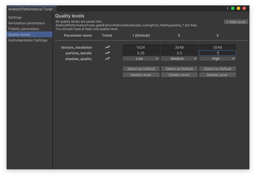 These parameters can be regrouped into quality levels (for example "low", "medium", and "high"). To have these parameters properly reported by Android Performance Tuner, and then analyzed and visualized in the Google Play Console, you must expose the parameters to the plugin. Add your fidelity parameters in the Fidelity parameters tab.