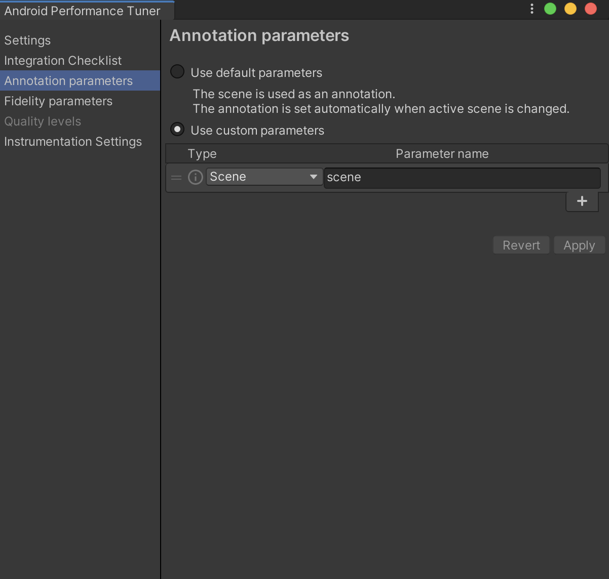 Ces paramètres peuvent être regroupés en niveaux de qualité (par exemple, "Faible", "Moyen" et "Élevé"). Pour que ces paramètres soient correctement signalés par Android Performance Tuner, puis analysés et visualisés dans la Google Play Console, vous devez les mettre à la disposition du plug-in. Ajoutez vos paramètres de fidélité dans l'onglet Fidelity parameters (Paramètres de fidélité).