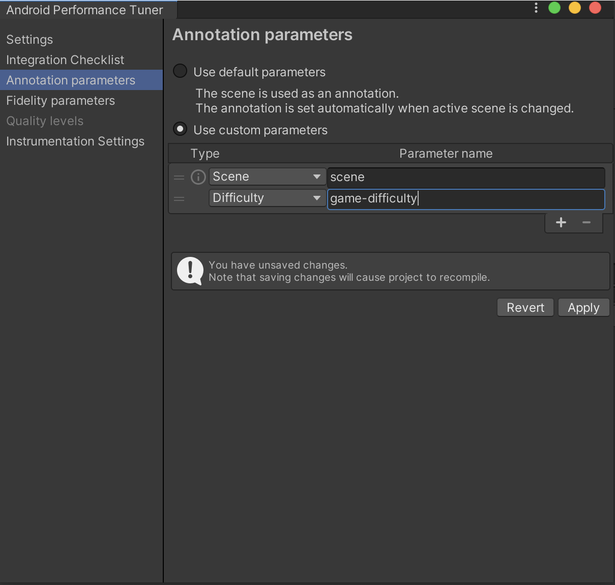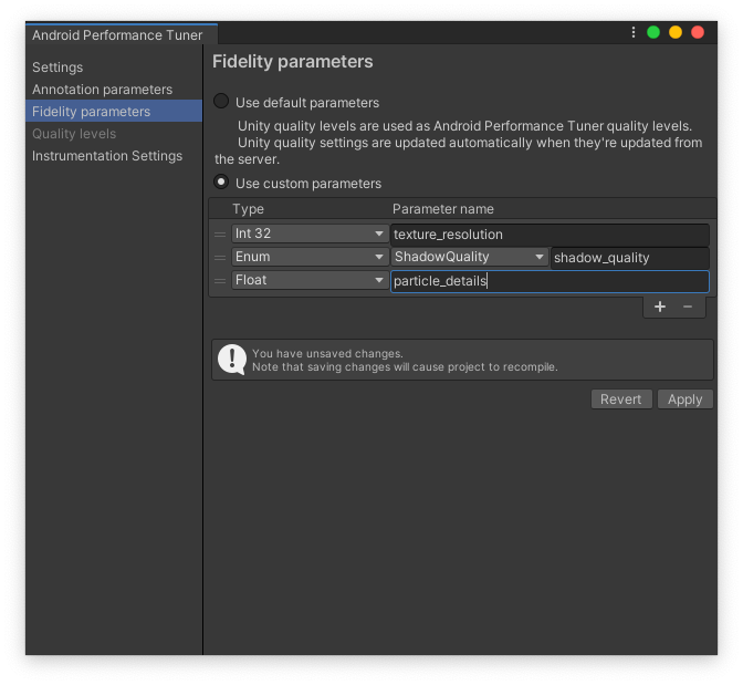 Te parametry można pogrupować według poziomów jakości (np. „niski”, „średni” i „wysoki”). Aby te parametry były prawidłowo raportowane przez Android Performance Tuner, a następnie analizowane i wizualizowane w Konsoli Google Play, musisz udostępnić je wtyczce. Dodaj parametry wierności na karcie Parametry wierności.