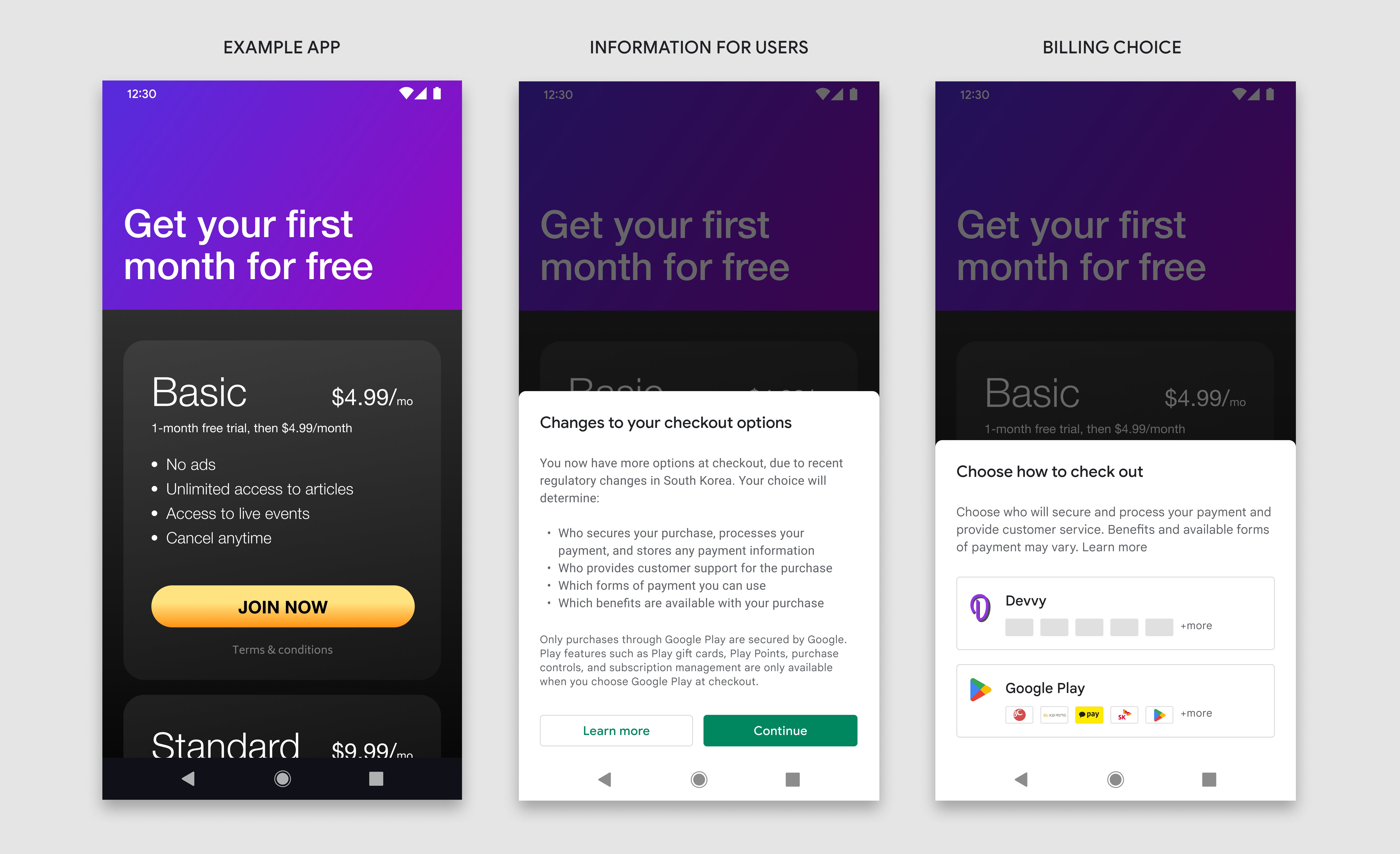 ユーザー エクスペリエンスの一貫性を維持するため、そしてユーザーが情報に基づいた選択をできるようにするため、代替のアプリ内課金システムを Google Play に提供する場合には、情報画面と個別の課金選択画面を表示する必要があります。情報画面は、ユーザーが初めて購入を行う際にのみユーザーごとに表示する必要がありますが、課金選択画面は購入前に毎回表示する必要があります。両画面のユーザー向けメッセージと UI 仕様は、以下のガイドラインに沿って実装する必要があります。