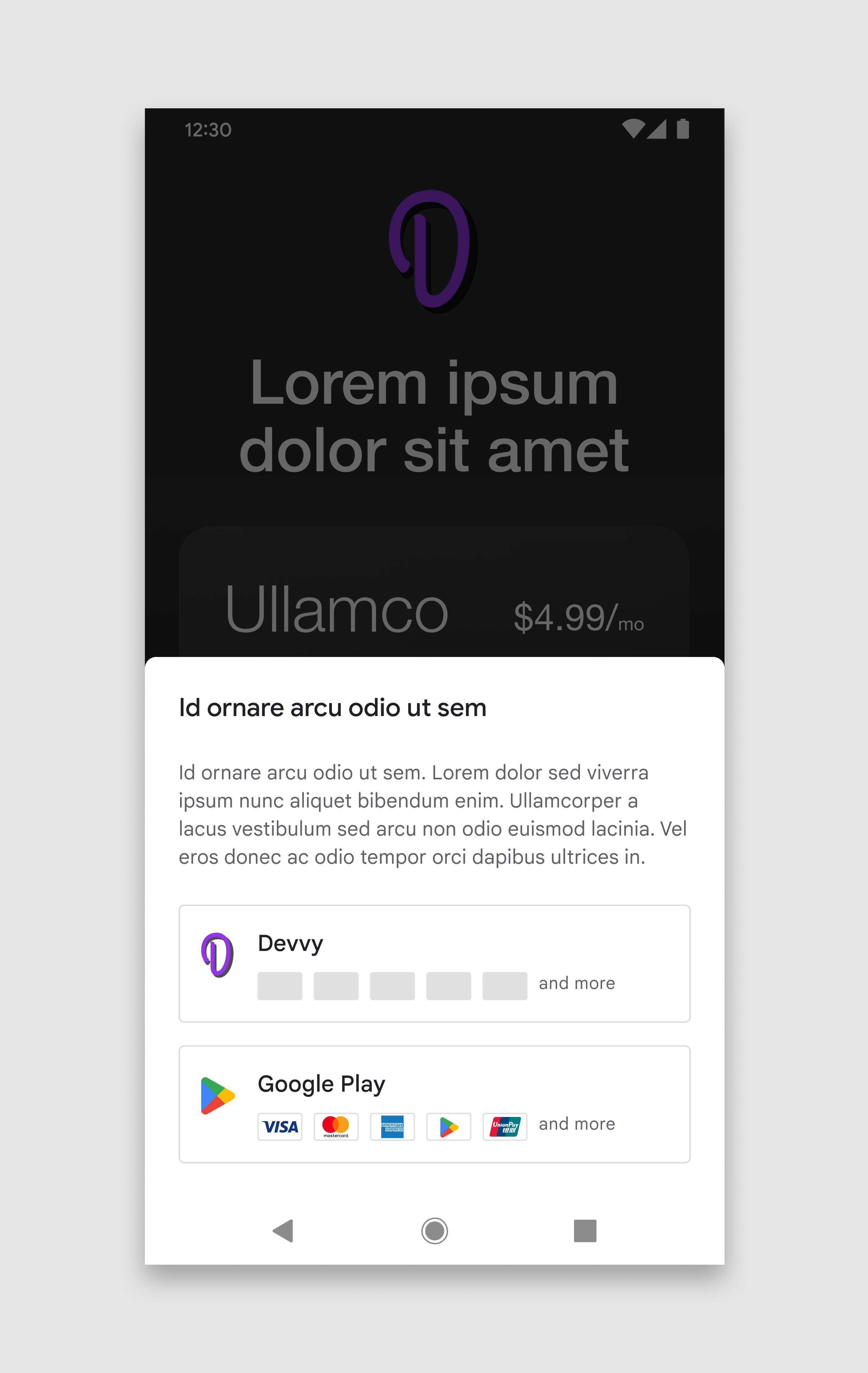במסך בחירת אמצעי התשלום מוצגות למשתמשים שתי אפשרויות להשלמת הרכישה. כדי לעזור למשתמשים לקבל החלטה מושכלת, בכל אפשרות של שירות חיוב מוצגים גם אמצעי התשלום הזמינים. אחרי שהמשתמשים יבחרו, הם ימשיכו להשלים את הרכישה דרך מערכת החיוב הזו.
