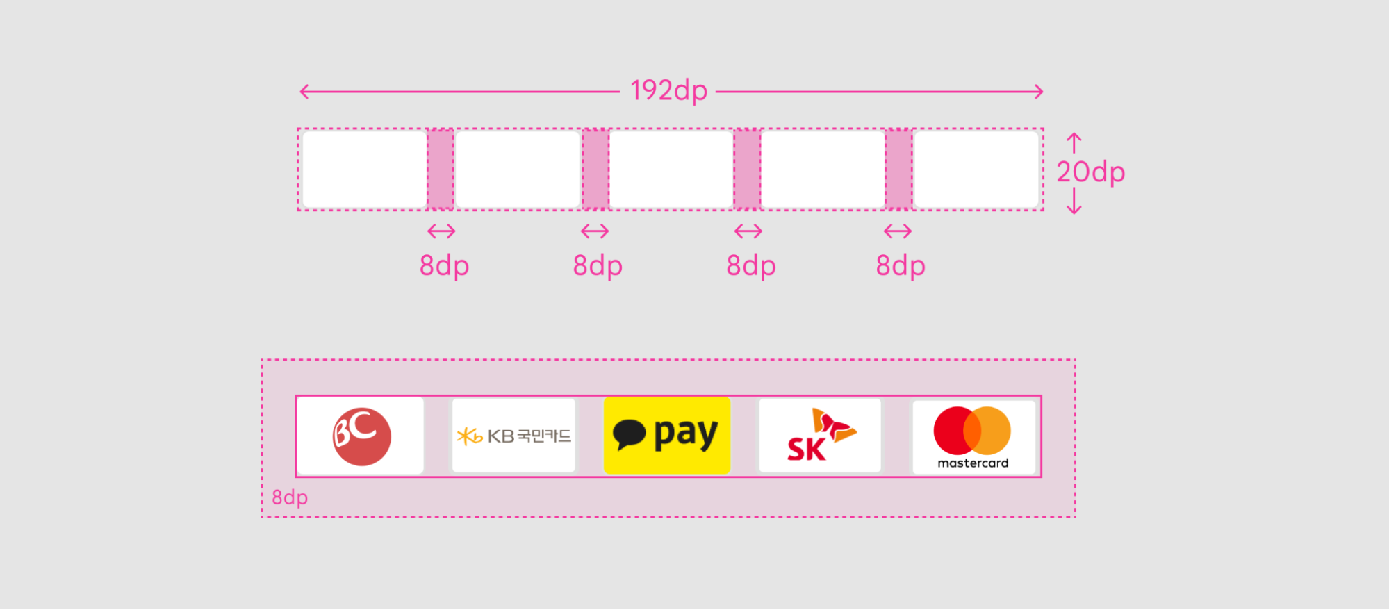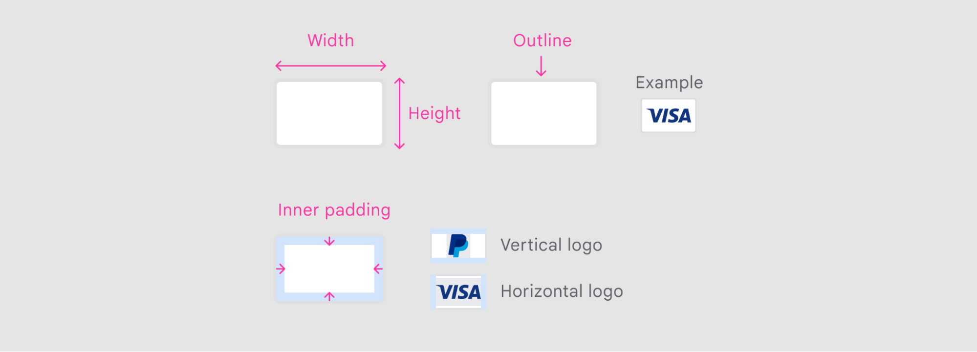 The payment method cards included in the image asset must follow the following guidelines for size, spacing, and style.