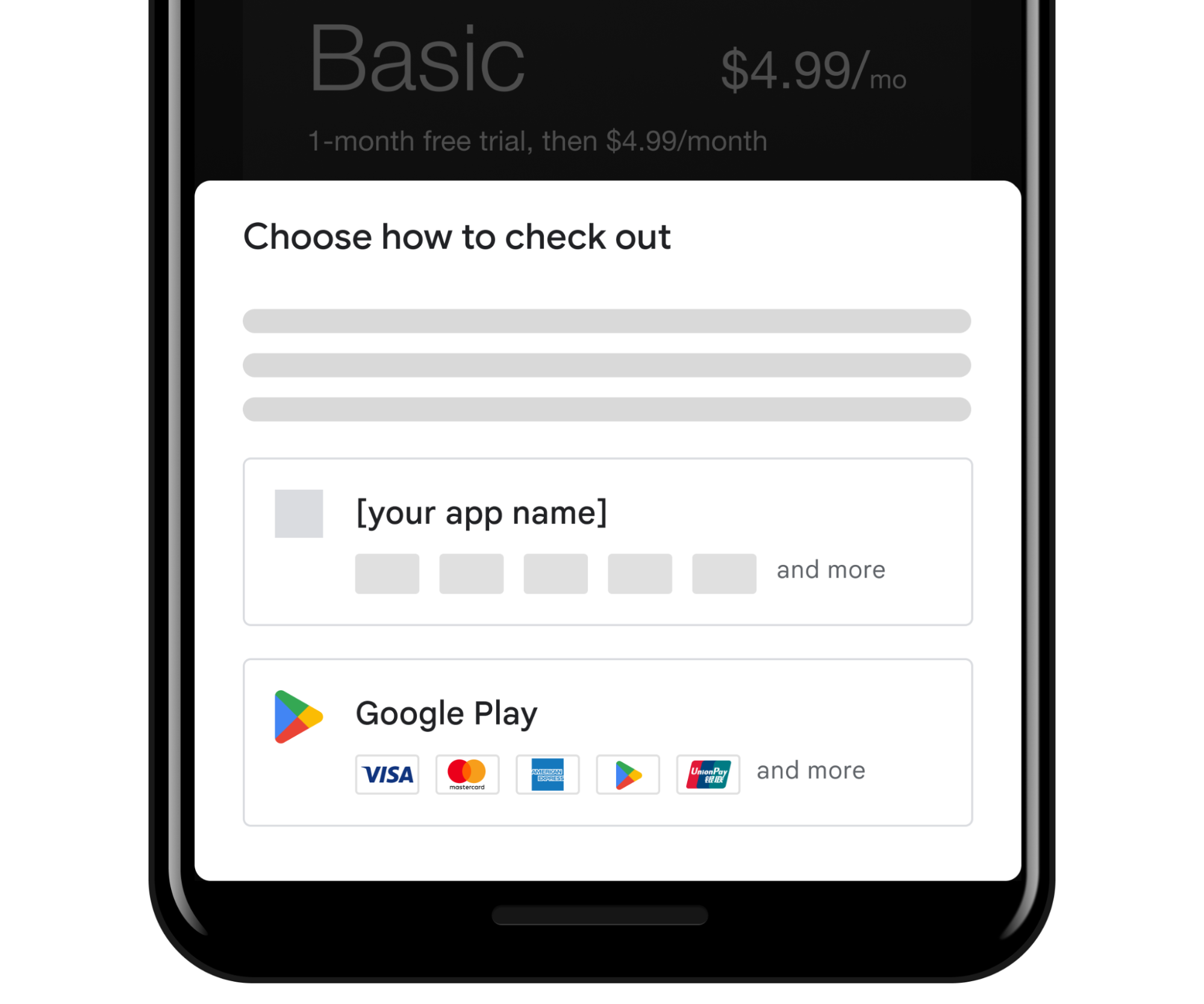 - If the user chooses to use Google Play's billing system, the billing flow continues using Google Play's billing standard interface.