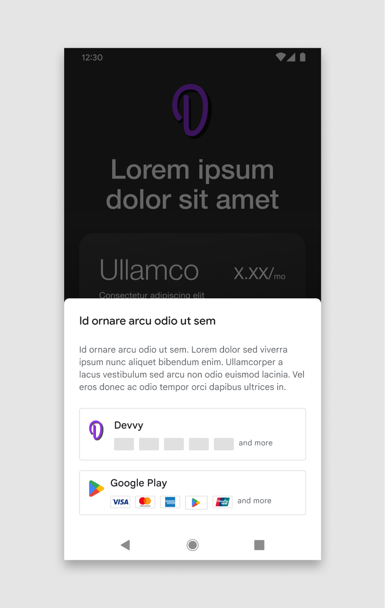 - Alternative billing only (without user choice): Your app offers an alternative billing system without the presence of Google Play Billing as an option.