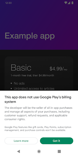 The information screen helps users understand that only an alternative billing system is being offered within the eligible app. The information screen will be shown to users at the start of their first purchase in your app after alternative billing has been enabled. This message will not be displayed on subsequent purchases made by the same user in your app on the same device. Note that there may be times when the dialog is shown again to a user in situations such as if the user clears caches on their device.
