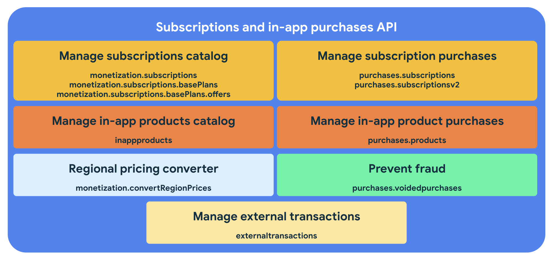 Interfejs Google Play Developer API zawiera kilka punktów końcowych, które umożliwiają synchronizację backendu z backendem Google Play. W szczególności interfejs API subskrypcji i zakupów w aplikacji obsługuje funkcje związane ze sprzedażą produktów cyfrowych w Google Play.