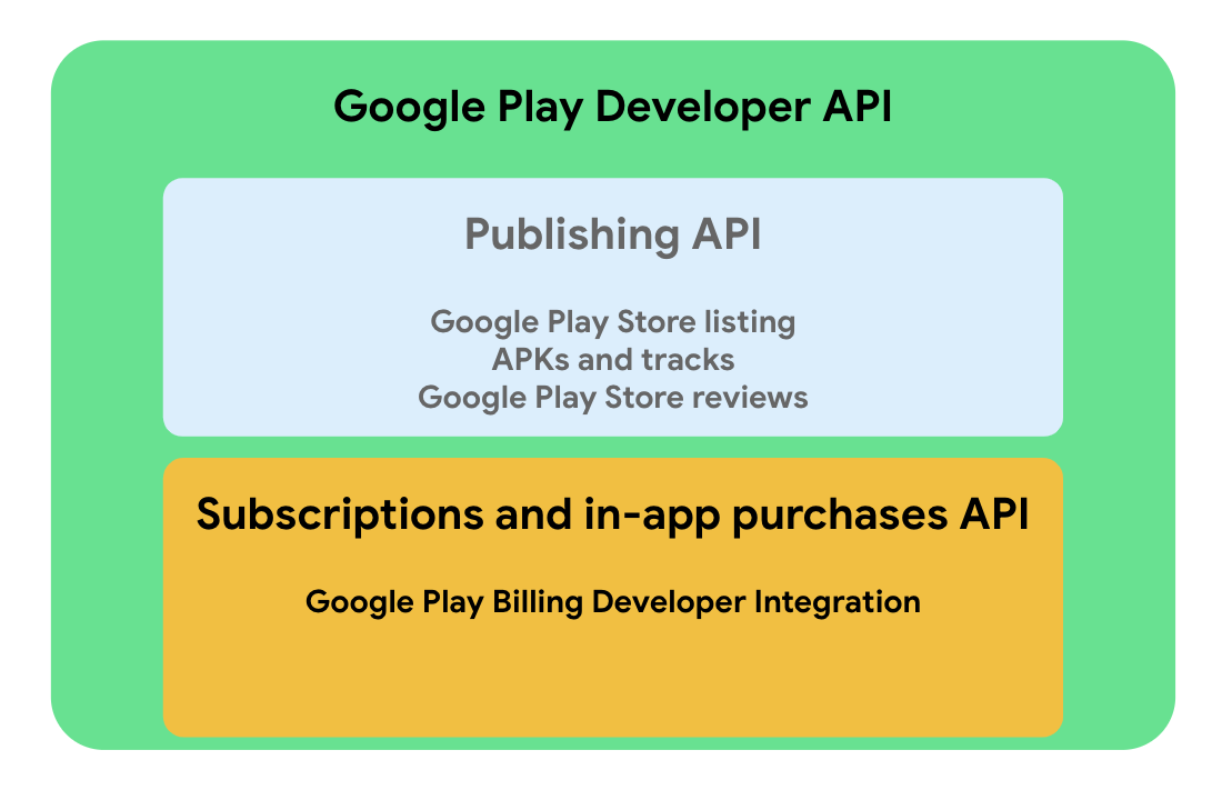 • Google Play Developer API. 게시 및 앱 관리 작업을 프로그래매틱 방식으로 처리하는 데 사용하는 REST API입니다.