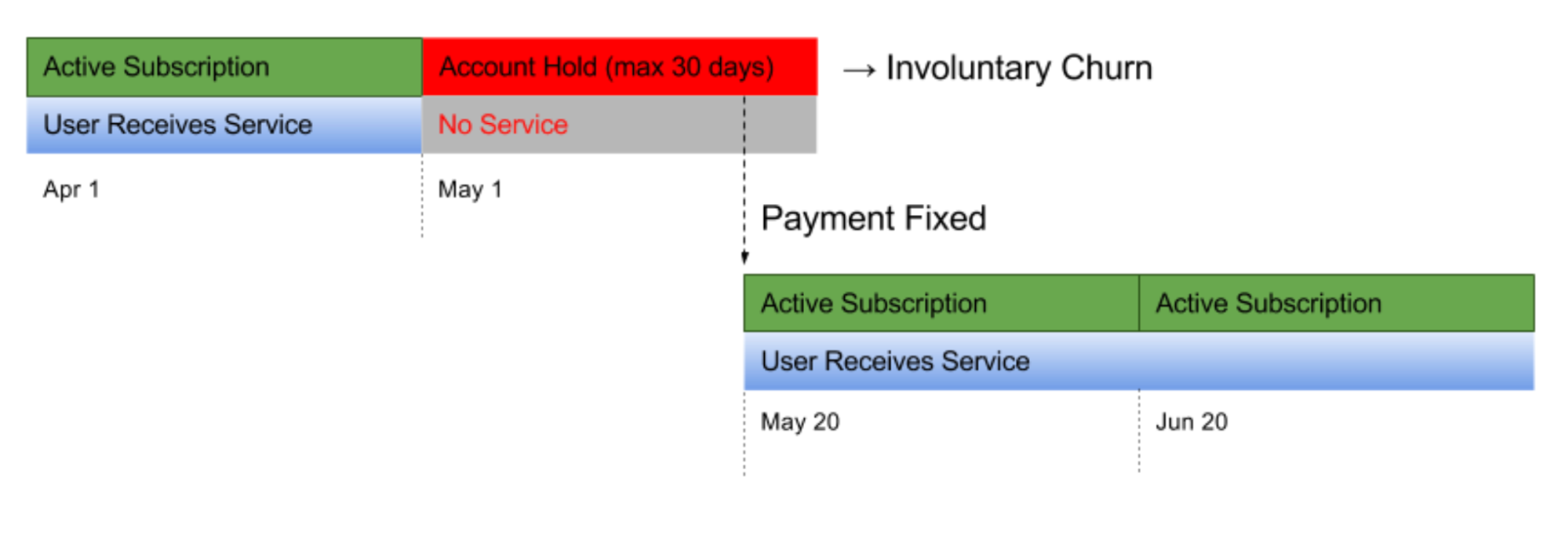চিত্র 2 একটি সাবস্ক্রিপশনের জন্য একটি টাইমলাইন দেখায় যা একটি গ্রেস পিরিয়ডে প্রবেশ করে এবং ব্যবহারকারী যখন তাদের অর্থপ্রদানের পদ্ধতি ঠিক করে তখন পুনরুদ্ধার হয়। গ্রেস পিরিয়ড শেষ হওয়ার পরে, ব্যবহারকারীর সাবস্ক্রিপশন সুবিধা হারাবেন এবং অ্যাকাউন্ট হোল্ডে চলে যাবেন।