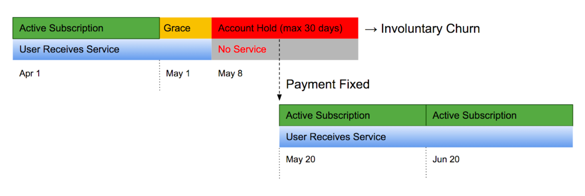 La figure 2 présente la chronologie d'un abonnement qui est soumis à un délai de grâce, puis qui est rétabli lorsque l'utilisateur corrige son mode de paiement. À la fin du délai de grâce, l'utilisateur doit perdre tous les avantages de l'abonnement et être soumis à un blocage de compte.