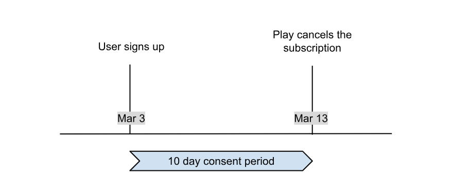 در 3 مارس، یک کاربر برای اشتراک در کره جنوبی با دوره آزمایشی رایگان 10 روزه ثبت نام می کند. کاربر با افزایش قیمت در حین ثبت نام موافقت می کند. در این سناریو، Play افزایش قیمت را در 13 مارس اعمال می کند.