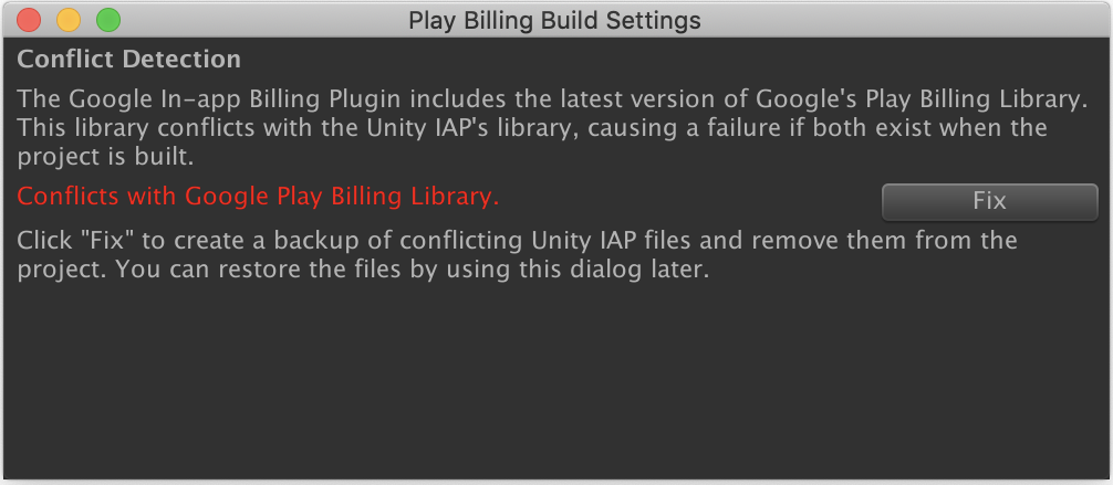 در پنجره Play Billing Build Settings، روی Fix کلیک کنید. این تضاد را حل می کند و فایل های Unity IAP متضاد را به یک پوشه پشتیبان منتقل می کند. بعد از اینکه روی Fix کلیک کردید، دکمه به Restore تغییر میکند که میتوانید روی آن کلیک کنید تا فایلهای اصلی و متناقض بازیابی شوند.
