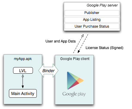 Google Play Licensing, नेटवर्क पर आधारित एक सेवा है. इसकी मदद से, कोई ऐप्लिकेशन, Google Play के भरोसेमंद लाइसेंसिंग सर्वर से क्वेरी कर सकता है. इससे यह पता चलता है कि ऐप्लिकेशन को मौजूदा डिवाइस के उपयोगकर्ता के लिए लाइसेंस दिया गया है या नहीं. लाइसेंस देने वाली सेवा, Google Play के लाइसेंसिंग सर्वर की इस क्षमता पर आधारित होती है कि वह यह तय कर सके कि किसी उपयोगकर्ता के पास किसी ऐप्लिकेशन को इस्तेमाल करने का लाइसेंस है या नहीं. Google Play, किसी उपयोगकर्ता को लाइसेंस वाला उपयोगकर्ता तब मानता है, जब वह ऐप्लिकेशन का खरीदार हो.