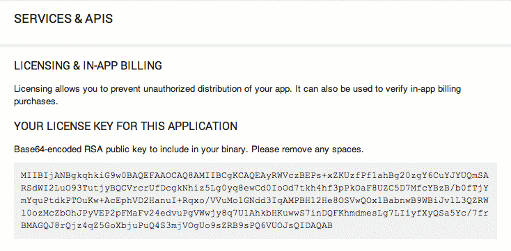 - लाइसेंस देने के लिए, ऐप्लिकेशन की सार्वजनिक कुंजी पाएं. किसी ऐप्लिकेशन में लाइसेंसिंग लागू करते समय, आपको सार्वजनिक पासकोड स्ट्रिंग को ऐप्लिकेशन में कॉपी करना होगा. 'सभी ऐप्लिकेशन' में जाकर, 'सेवाएं और एपीआई' पेज पर लाइसेंस देने के लिए, ऐप्लिकेशन की सार्वजनिक कुंजी हासिल की जा सकती है.
