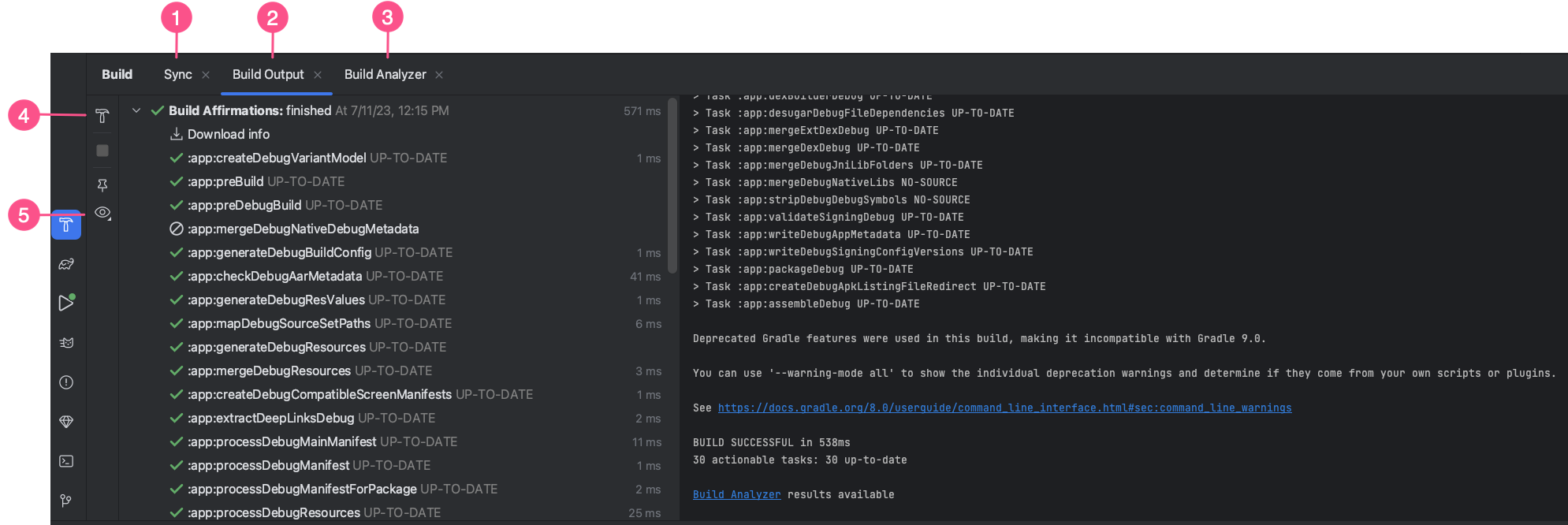- Build Output tab: Displays the tasks that Gradle executes as a tree,