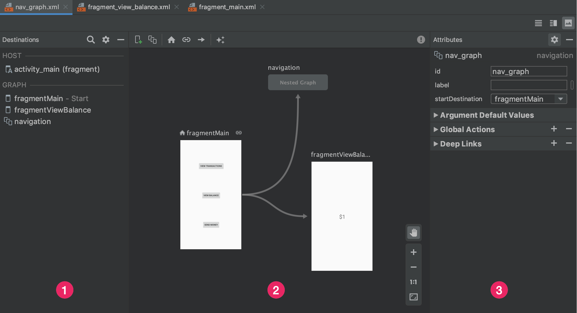 - Graph Editor: Incluye una representación visual de tu gráfico de navegación. Puedes cambiar entre la vista Design y la representación del XML subyacente en la vista Text.