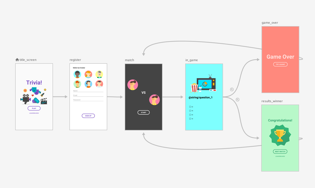 מומלץ להגדיר את מסך ההתאמה כיעד ההתחלה של תרשים הניווט ברמה העליונה, ולהעביר את מסכי הכותרת וההרשמה לתרשים מקונן, כמו שמוצג באיור 1:
