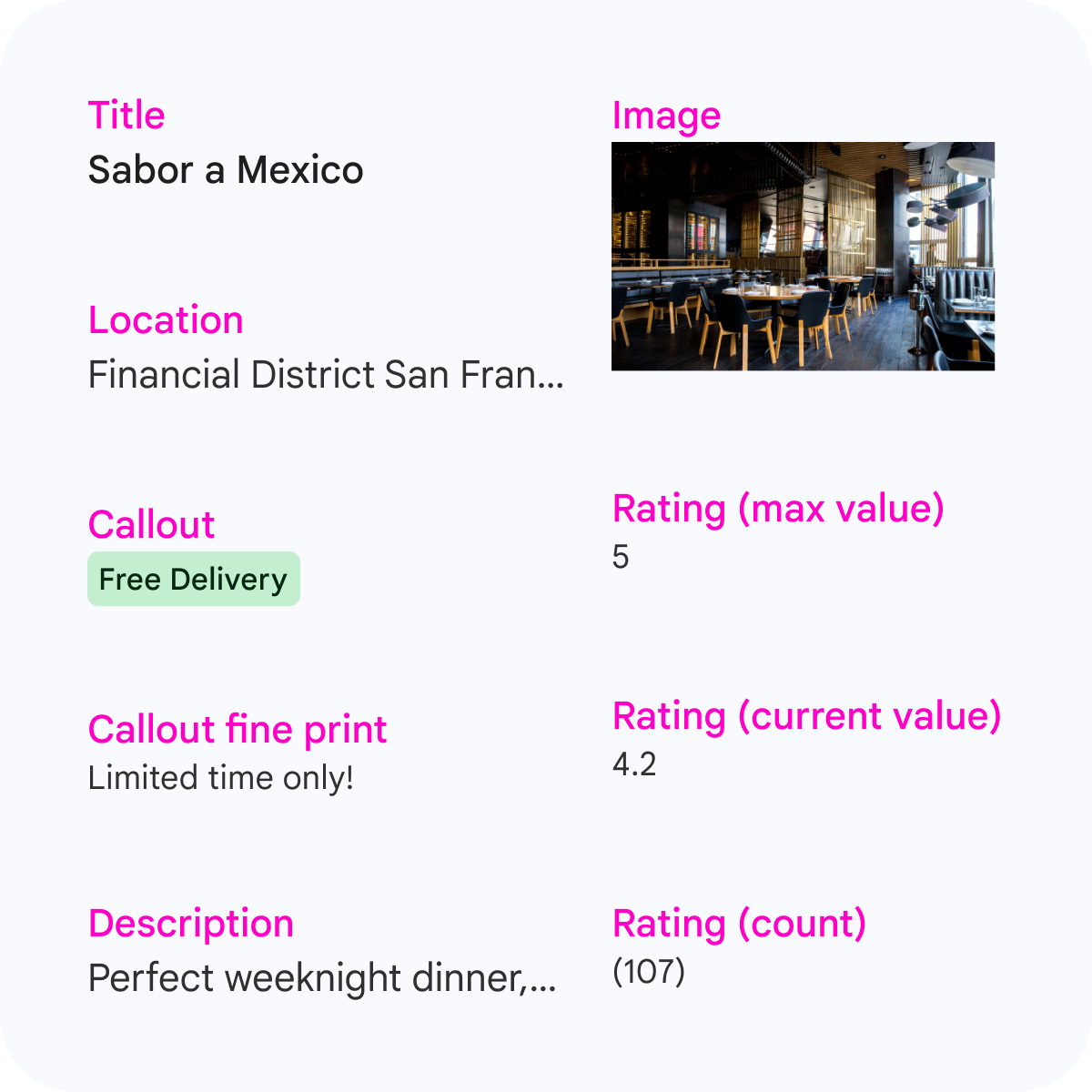 Zusatzinformationen | Optional | Callout, um eine Werbeaktion, ein Event oder ein Update für das Rezept zu präsentieren, falls verfügbar. | Freier Text Empfohlene Textgröße: unter 45 Zeichen (bei zu langem Text werden möglicherweise Auslassungspunkte angezeigt) |
