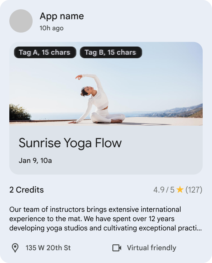 איור 2: ממשק משתמש שבו מוצגת PersonEntity אחת באשכול Recommendations. EventEntity: מייצג אירוע שיתרחש בעתיד. שעת ההתחלה של האירוע היא נתון חשוב שצריך להעביר למשתמשים. אפשר להשתמש בישות הזו כדי להציג אירועים כמו קמפיין לעידוד תרומת דם, סדנאות, שיעורי כושר או יוגה וכו' שקשורים לבריאות ולכושר.