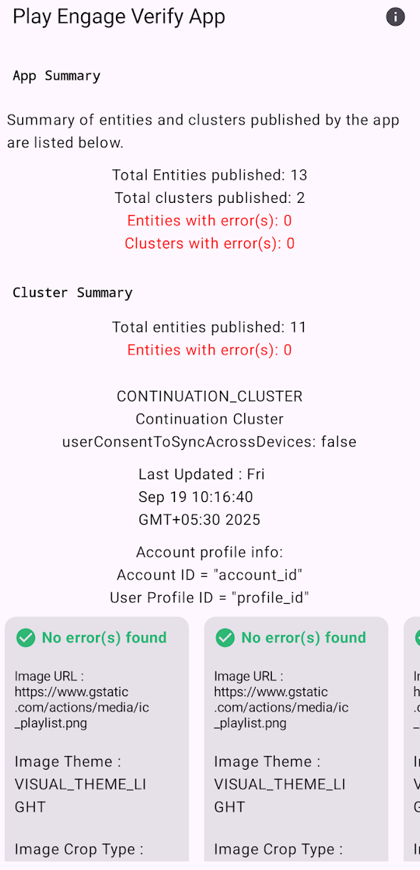 पुष्टि करने वाले ऐप्लिकेशन में, हर क्लस्टर को एक अलग लाइन के तौर पर दिखाया जाना चाहिए.