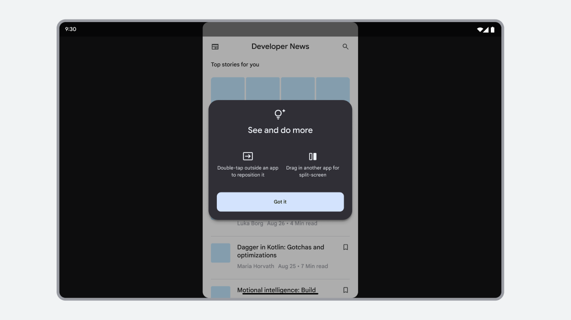 Posicionamento configurável:em telas grandes, os fabricantes de dispositivos podem posicionar o app no lado esquerdo ou direito da tela, facilitando a interação.