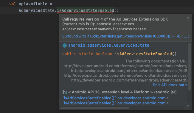 fun isAdServicesAvailable(): Boolean { return SdkExtensions.getExtensionVersion(SdkExtensions.AD_SERVICES) >= 4 }
