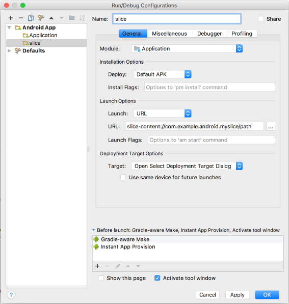 از پیکربندی اجرای slice که در بخش Slice Viewer در بالا ایجاد کردید، استفاده کنید و URI Slice خود (به عنوان مثال slice-content://com.android.example.slicesample/hello ) Hello World Slice را ارسال کنید تا آن را در قسمت مشاهده کنید. نمایشگر برش.