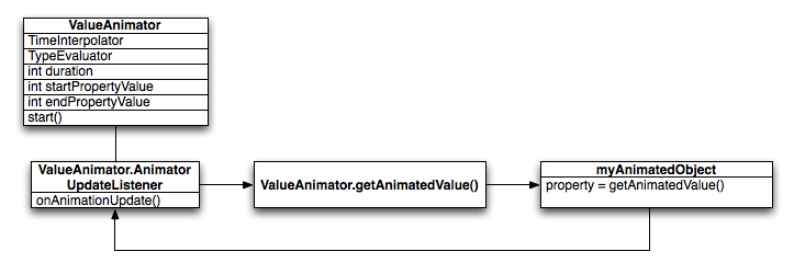 في هذه التعليمة البرمجية، يبدأ ValueAnimator بحساب قيم المؤثر المتحرك بين startPropertyValue وendPropertyValue باستخدام منطق الذي يوفّره MyTypeEvaluator لمدة 1000 ملي ثانية، عند تنفيذ الطريقة start().