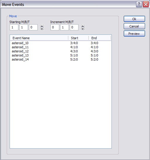A função Move age de forma semelhante à Replicar função, que permite editar vários segmentos ou eventos uma vez, neste caso movê-los no tempo. Assim como "Replicate", há dois tipos de movimentos janelas, uma para segmentos e outra para eventos. As janelas parecem o seguinte: