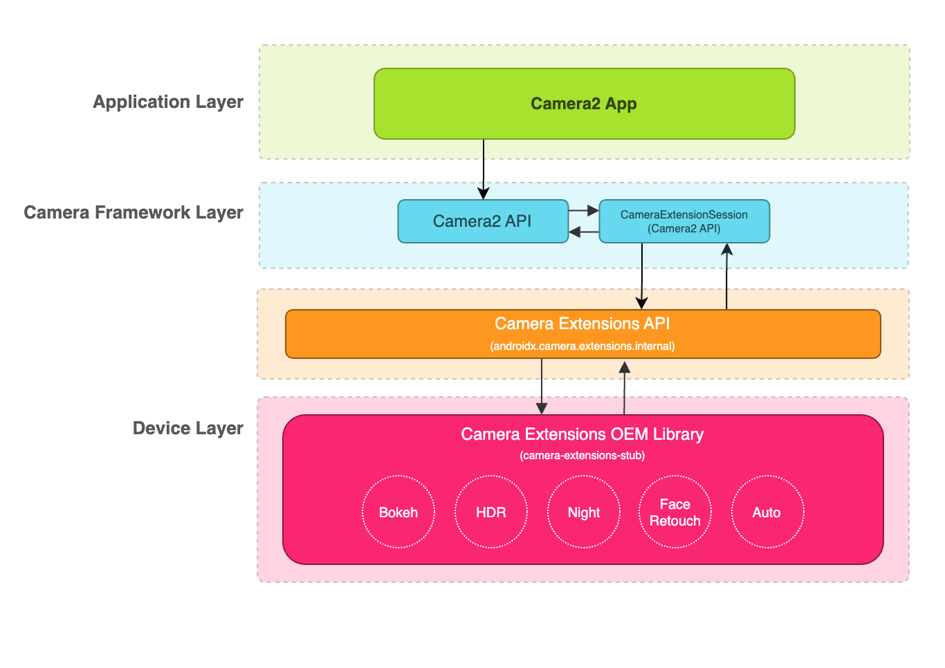 A Camera2 application can use extensions through the Camera2 API. The Camera2 API provides ways to query for available extensions, configure an extension camera session, and communicate with the Camera Extensions OEM library. This allows your application to use extensions like Night, HDR, Auto, Bokeh, or Face Retouch.