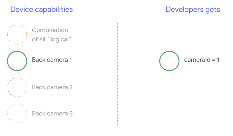 در بیشتر موارد، دستگاه‌هایی که اندروید 9 و بالاتر دارند، همه دوربین‌های فیزیکی (به جز سنسورهای کمتر رایج مانند مادون قرمز) را همراه با دوربین‌های منطقی با کاربری ساده‌تر در معرض دید قرار می‌دهند. برای هر ترکیبی از جریان‌هایی که تضمین شده است، یک جریان متعلق به یک دوربین منطقی را می‌توان با دو جریان از دوربین‌های فیزیکی زیرین جایگزین کرد.