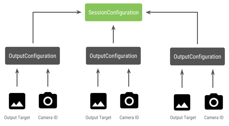 Çok kameralı bir cihazda fiziksel kameralar kullanırken tek bir CameraDevice (mantıksal kamera) ve tek bir kamerada bu kamerayla etkileşimde bulunun kabul edilir. API'yi kullanarak tek oturum oluşturma Önceki fiyatı: CameraDevice.createCaptureSession(SessionConfiguration config) API düzeyi 28'de eklenmiştir. Oturum yapılandırmasında bir dizi çıkış vardır. Her biri bir dizi çıkış hedefine sahip yapılandırma ve isteğe bağlı olarak fiziksel kamera kimliğini girin.