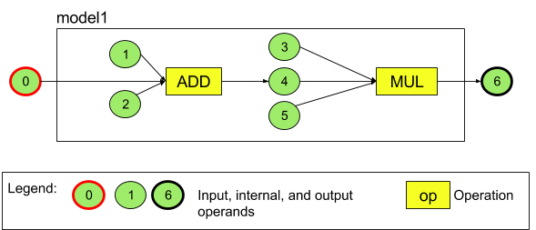 Например, на рисунке 3 представлена ​​модель с двумя операциями: сложением и умножением. Модель принимает входной тензор и создаёт один выходной тензор.