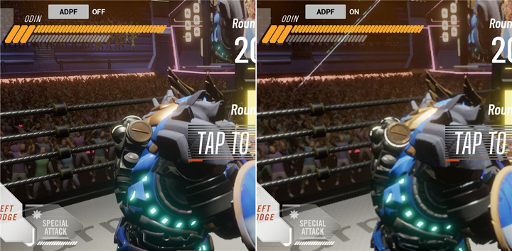 In the previous figures 3 and 4, the same view of the robot can be seen side by side. If a closer look is taken, the graphics settings adjusted by using ADPF is seen. Notice the floor of the ring, the shoulder of the robot, the ropes of the ring and the crowd? All of them seem to be at a slightly lower quality, which was done by using ADPF.