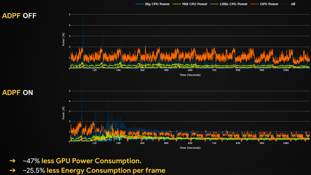 ผลลัพธ์จาก ADPF ที่เปิดและปิดอยู่จะแสดงในรูปภาพที่แสดงก่อนหน้านี้ แสดงให้เห็นว่าเฟรมเรตของเกมและการใช้พลังงานของแกนประมวลผลแตกต่างกัน อัตราเฟรมจะดีขึ้นสูงสุด 57% เมื่อ ADPF เปิดอยู่ เมื่อ ADPF ปิดอยู่ GPU จะกินไฟเป็นจำนวนมาก จากนั้นแกน CPU หลักจะมีไฟกระชากซึ่งสอดคล้องกับปริมาณงานของ GPU เนื่องจากกำลังประมวลผลตามปริมาณที่ระบบขอให้ดำเนินการ เมื่อ ADPF เปิดอยู่ แกน CPU หลักจะตอบสนองต่อการจำกัดและลดการสิ้นเปลืองพลังงานโดยรวมของแกนทั้งหมดในอุปกรณ์