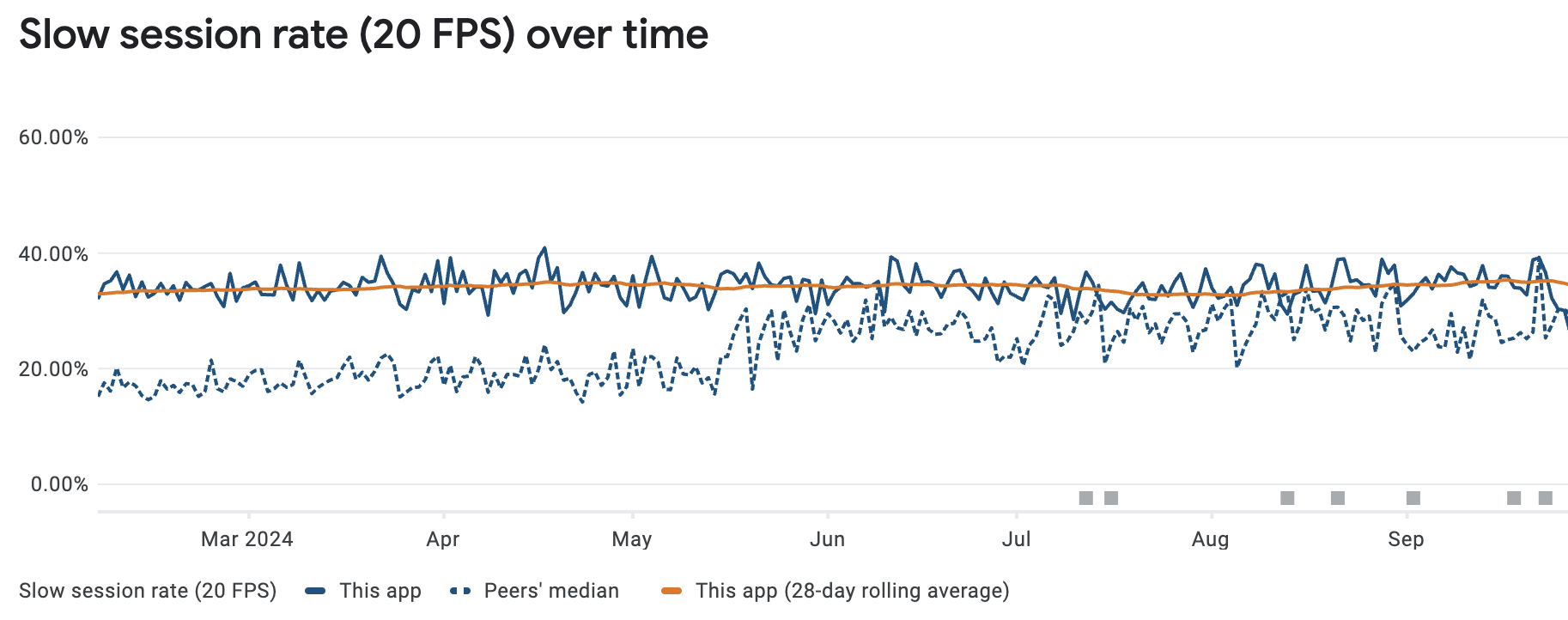 Sessions lentes est une métrique Android Vitals dans la Google Play Console. Une session lente comporte plus de 25% d'images affichées lentement. L'affichage est considéré comme lent si: