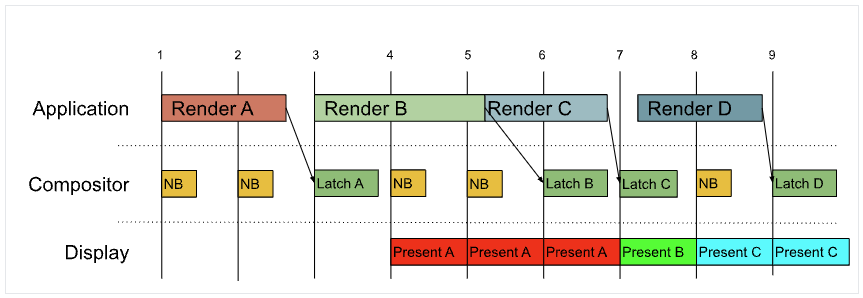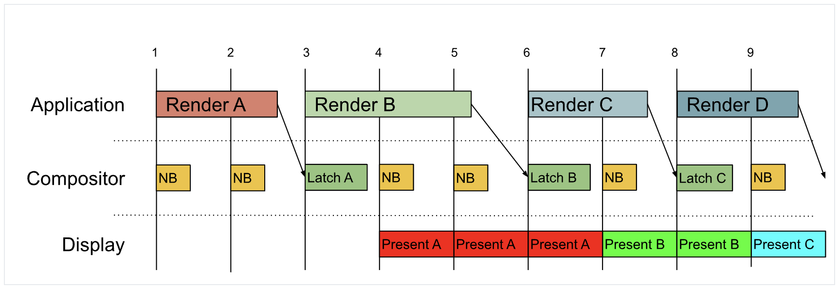 ) का इस्तेमाल करके इस समस्या को हल करती है. इससे ऐप्लिकेशन में इंजेक्ट किए गए इंतज़ार की वजह से, डिसप्ले पाइपलाइन को बैक प्रेशर बनने से रोका जा सकता है. फ़्रेम A में अब भी एक अतिरिक्त फ़्रेम दिख रहा है, लेकिन फ़्रेम B अब सही तरीके से दिख रहा है.