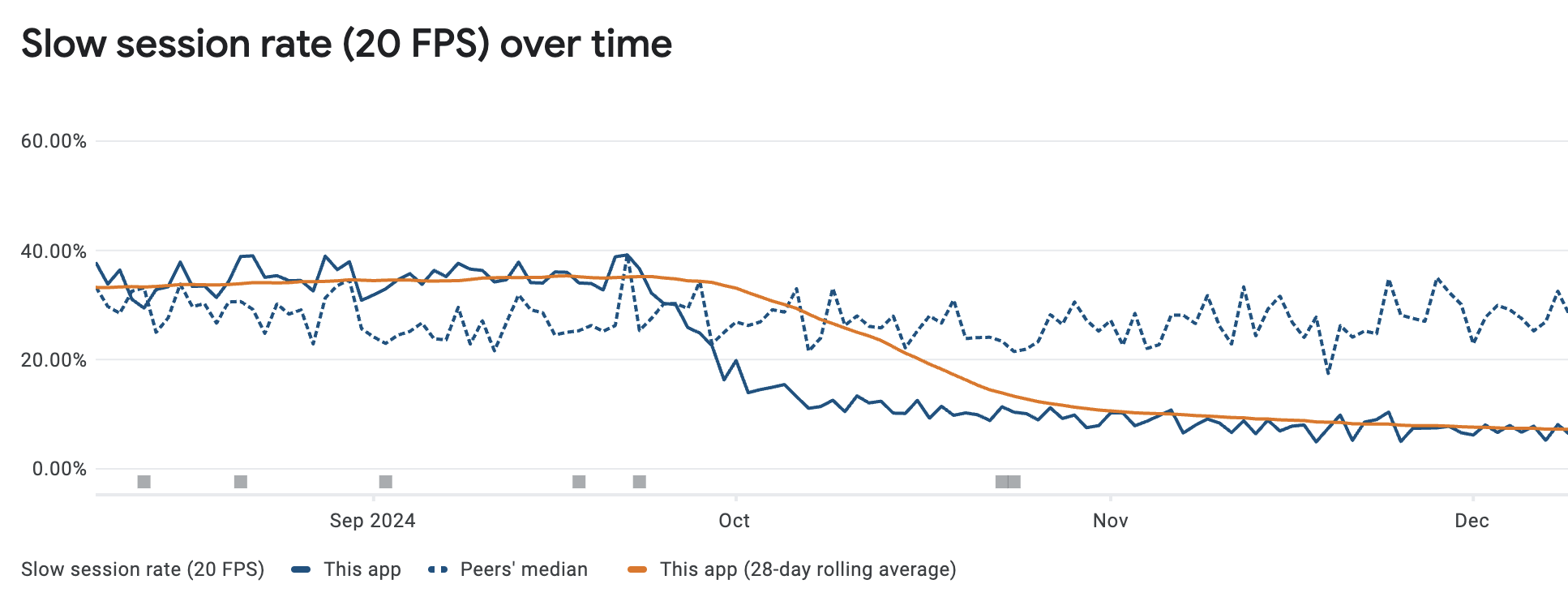 धीमे सेशन, Google Play Console में 'Android की ज़रूरी जानकारी' की मेट्रिक है. धीमे सेशन में 25% से ज़्यादा फ़्रेम धीमी रफ़्तार से रेंडर होते हैं. किसी फ़्रेम को धीमा तब माना जाता है, जब: