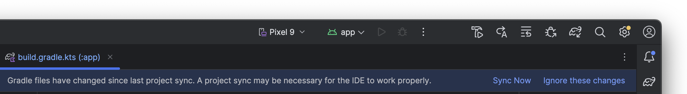 وقتی در فایل‌های پیکربندی ساخت در پروژه خود تغییراتی ایجاد می‌کنید، Android Studio از شما می‌خواهد که فایل‌های پروژه خود را همگام‌سازی کنید تا بتواند تغییرات پیکربندی ساخت را وارد کند و برخی بررسی‌ها را انجام دهد تا مطمئن شود پیکربندی شما خطای ساخت ایجاد نمی‌کند.