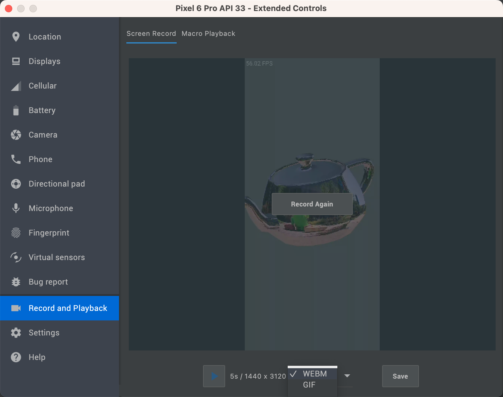 Wenn Sie einen Emulator verwenden, können Sie Videos direkt über den Tab Aufzeichnen und wiedergeben unter Erweiterte Steuerelemente aufzeichnen. Nachdem Sie ein Video aufgenommen haben, können Sie es im WEBM- oder GIF-Format speichern: